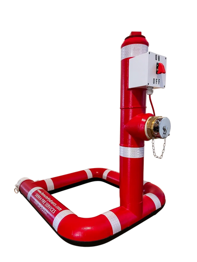 This device is strategically placed in an easily accessible area for personnel. It can be located up to 500 feet away from a single pump, located at the water source. (Capable of further distances with multiple pumps inline.) The pump control operation is integrated into the hydrant; switching it on sends a signal to the pump located at the water supply, initiating pumping, and switching it off shuts down the pump, placing it into standby status.